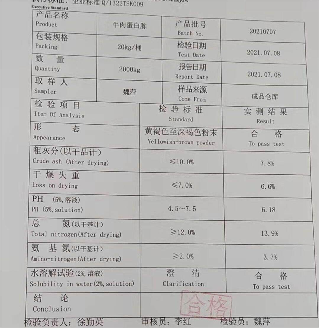 采用新鲜的牛肉为原料,经热处理、过滤、浓缩、干燥制成牛肉原粉,再将牛肉原粉经过水解、固体分离、冷藏过滤、浓缩干燥等工序即可获得。颜色浅,呈白色或浅黄色粉末状,易溶于水,水溶液呈淡黄色,水溶液澄清度高。采用新工艺制作而成,在培养基当中它起的主要作用是补充以及其它氮源的营养。为微生物提供C源、N源等物质。