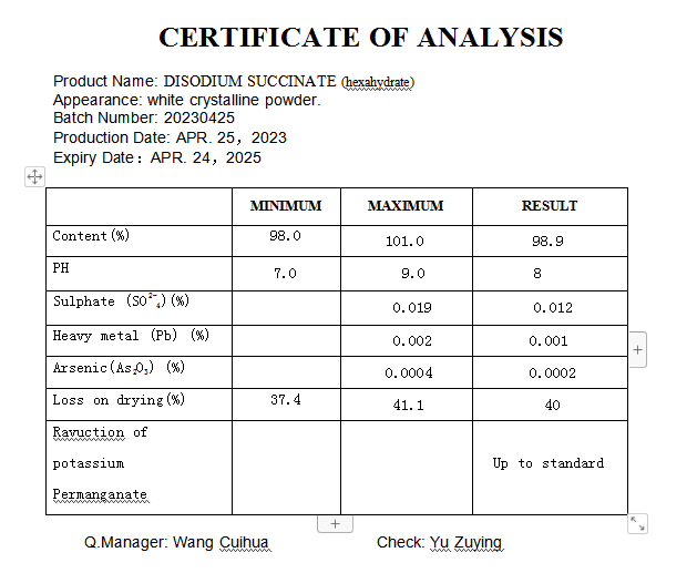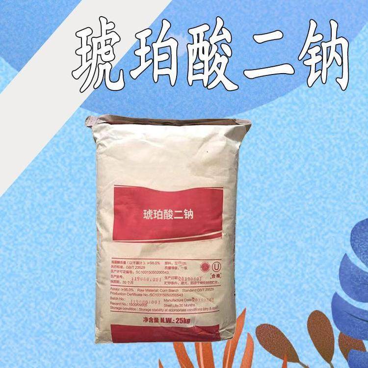 食品级琥珀酸二钠(干贝素)是一种增味剂,具有贝类鲜味,易溶于水且热稳定性好,常与谷氨酸钠等鲜味剂协同使用以增强调味效果。