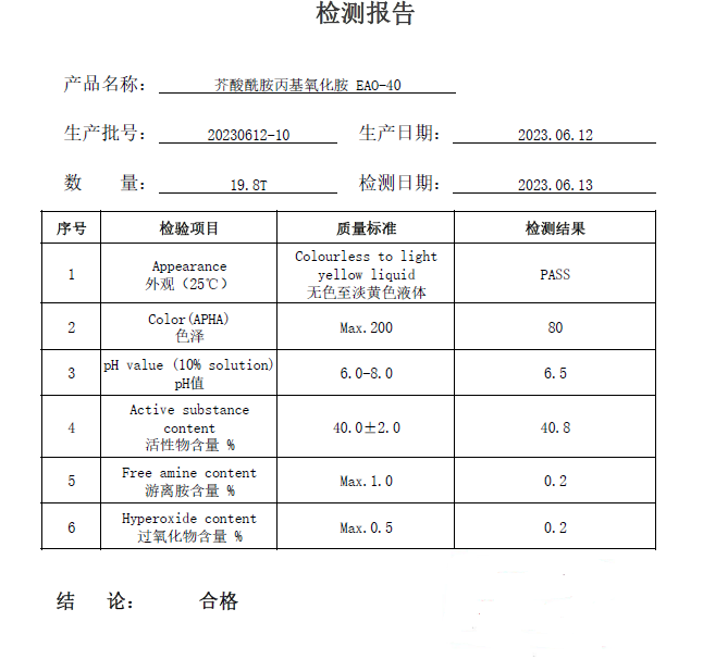 芥酸酰胺丙基氧化胺(EAO)是一种水溶性两性离子表面活性剂,它在多个领域中都有着应用。以下是详细解释: 一、产品特性 具有化学结构和性质,使其在水中能够形成蠕虫状胶束,进而形成透明粘弹性胶体。这种特性使得在日化和增稠剂等领域具有应用前景。 二、技术指标 技术指标包括外观、色泽、pH值、游离胺含量和固含量等。其中,外观为黄色粘稠液体,色泽(APHA) 值为200,pH值控制在6.0-8.0之间,游离胺含量 值为1.0%,固含量控制在40.0±2.0%范围内。这些技术指标保证了产品的稳定性和质量,为其在各个领域的应用提供了保障。 三、包装与储存 采用50kg/200kg塑料桶或者IBC吨桶包装,方便运输和储存。在储存过程中,应避光、清洁、阴凉、干燥处,室温下密闭保存,以保证产品的稳定性和提升保质期。 四、产品应用 在日用化工、印染、油田等领域有着应用。在日用化工领域,它可以用作洗发水、沐浴露等产品的增稠剂和调理剂,在印染领域,它可以作为染料和助剂的稳定剂,在油田领域,可以作为VES压裂液的主剂。