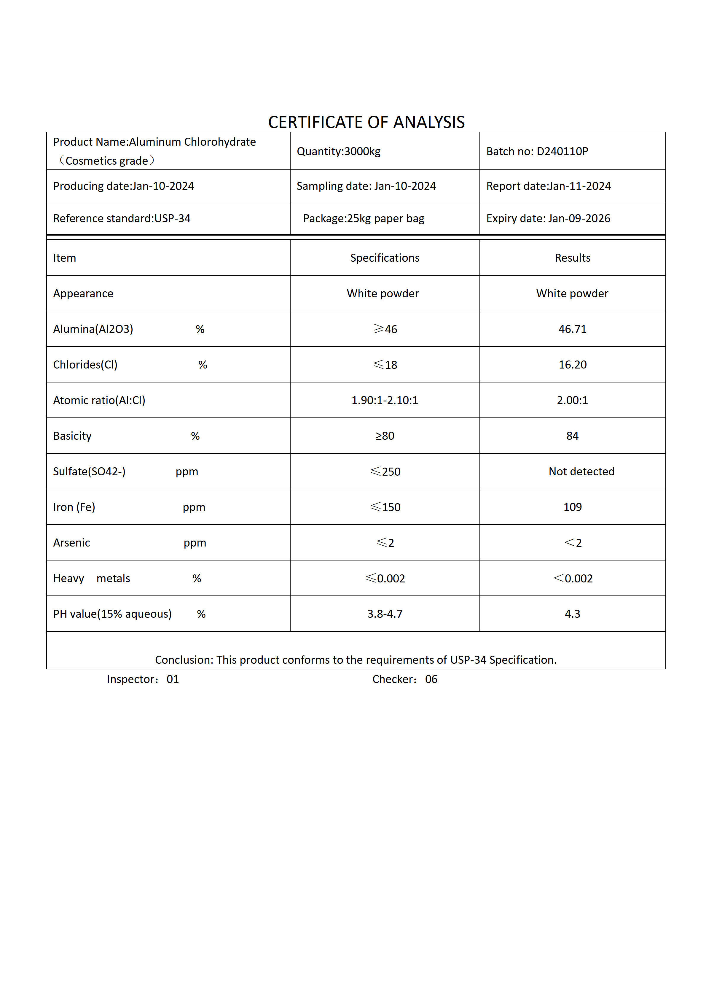 氯化羟铝(Aluminum Chlorohydrate)是一种无机高分子化合物,化学式为Al?(OH)?Cl·2H?O,CAS登录号为12042-91-0。它在多个工业领域有广泛应用,尤其在日化行业作为关键成分。