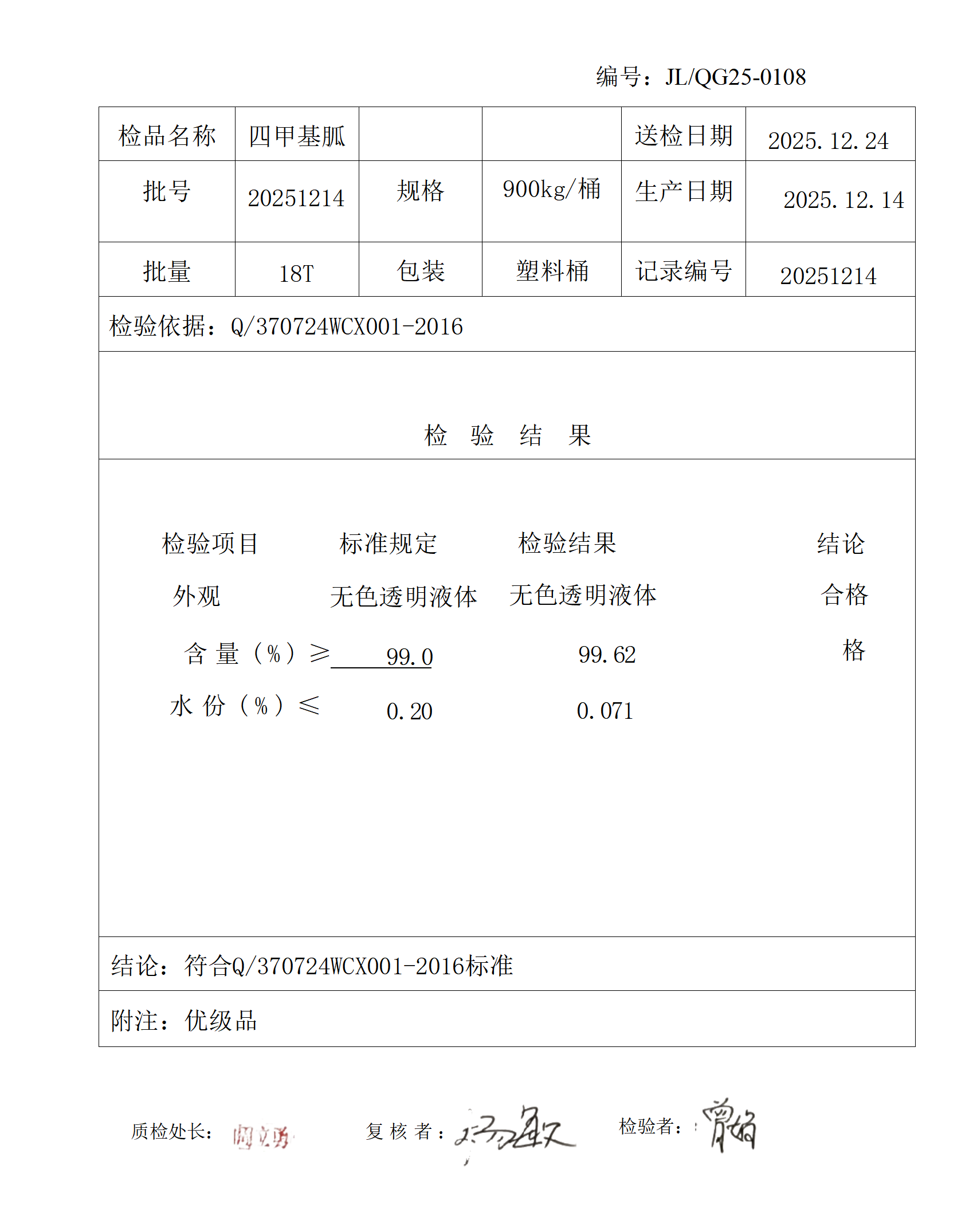 四甲基胍产品说明书 一、产品概述 分子式C5H13N3,分子量115.18,CAS号为80-70-6。它是一种有机化合物,以其独特的化学性质和多方面的应用而受到关注。 二、物化性质 具有一系列典型的物理和化学性质。其密度为0.918,熔点为-30°C,沸点范围为160-162°C。此外,其折射率在1.467-1.469之间,闪点为60°C。这些特性使得在多种化学反应和工艺过程中表现出色。 三、包装与储存 采用25kg/桶的包装方式,方便运输和储存。在储存过程中,请确保产品存放在阴凉、通风、干燥的地方,远离火源和热源。避免阳光直射和潮湿环境,以保证产品的稳定性和安全性。 四、主要用途 在聚氨基甲酸乙酯泡沫的生产过程中起到的催化作用,有助于产品的质量和性能。 在纺织工业中,用作锦纶(尼龙)、羊毛及其他蛋白质的均染剂,能够帮助染料更均匀地渗透到纤维中,提升染色效果。 具有溶解性能,可用于溶解7-ADCA、7-ACA、6-APA等弱酸性物质,为相关领域的生产提供便利。 在有机合成过程中,可用作催化剂,促进反应的进行,反应效率和产物的纯度。 五、安全注意事项 在使用时,请务必遵守相关的安全操作规程。穿戴适当的防护装备。避免吸入其粉尘或接触皮肤,以免对健康造成不良影响。如不慎接触,请立即用大量清水冲洗。 六、售后服务 我们承诺提供售后服务,如您在使用过程中遇到任何问题或需要技术支持,请随时与我们联系。