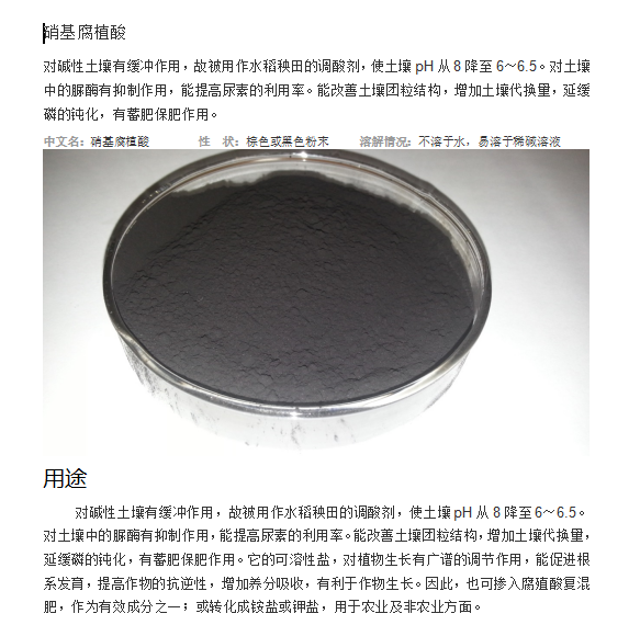 英文名称为nitrohumicacid或NHA,是一种棕色或黑色的粉末状物质。它在水中的溶解度较低,但易溶于稀碱溶液,这一特性使其在农业和其他领域有着应用。