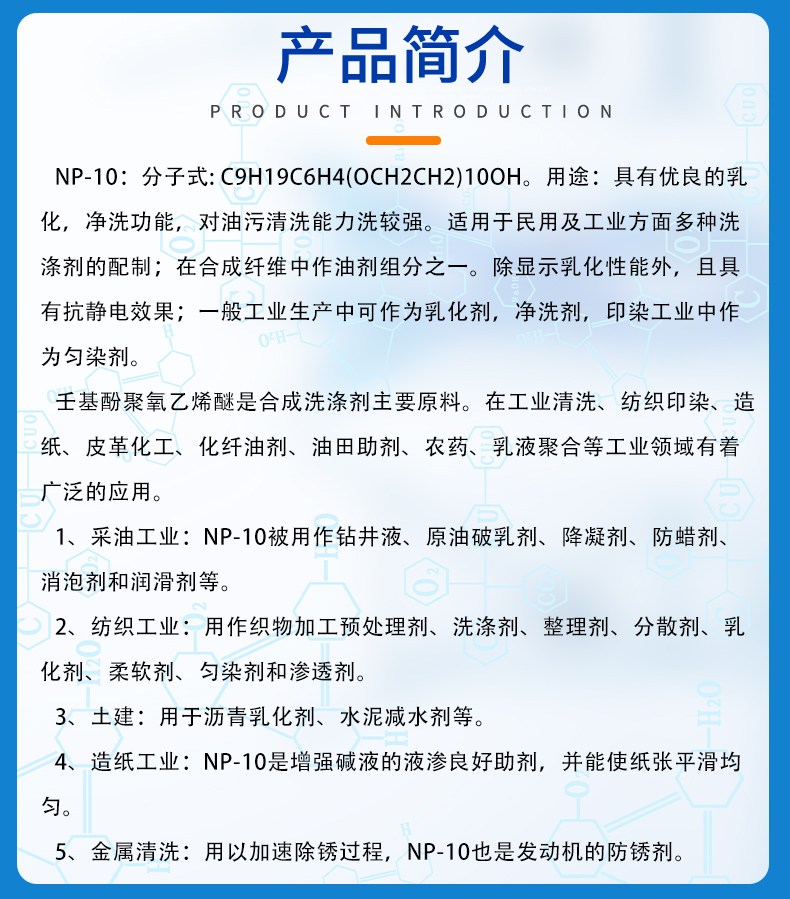 壬基酚聚氧乙烯醚(商品名:TX-n,NP-n)是一种由壬基酚与环氧乙烷加成得到的非离子型表面活性剂。本产品具有高活性物含量(≥99%),具有乳化、分散、润湿和渗透性能,应用于工业清洗、纺织印染、造纸、皮革化工、化纤油剂、油田助剂、乳液聚合等多个工业领域。