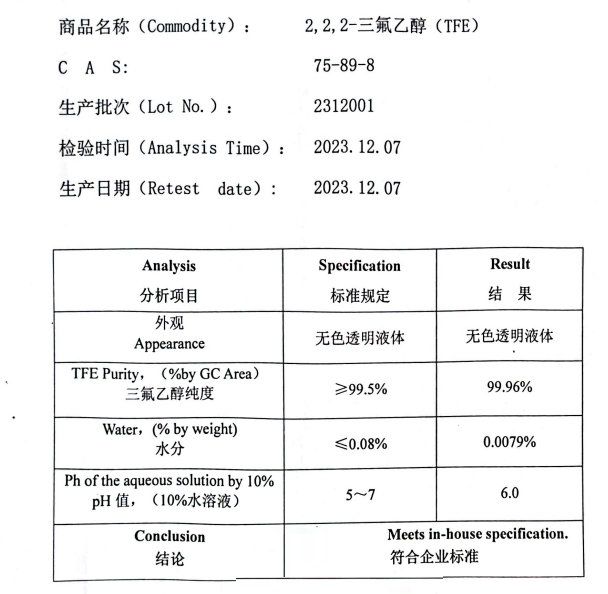2,2,2-三氟乙醇TFE 纯度99.5% 无色液体 有机合成催化剂 燃料电池膜材料 cas75-89-8
