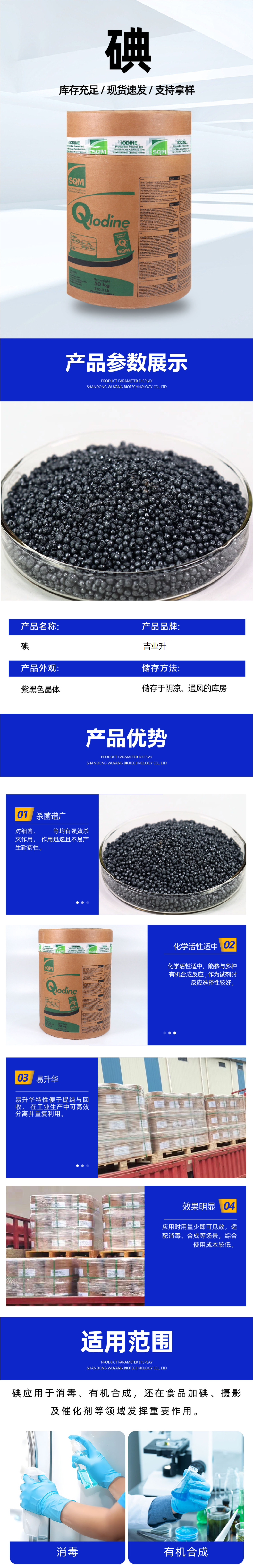 化工生产:是合成多种含碘有机和无机化合物的重要原料,例如碘仿、碘酸盐和其他精细化学品。用作催化剂或助催化剂参与某些类型的化学反应。