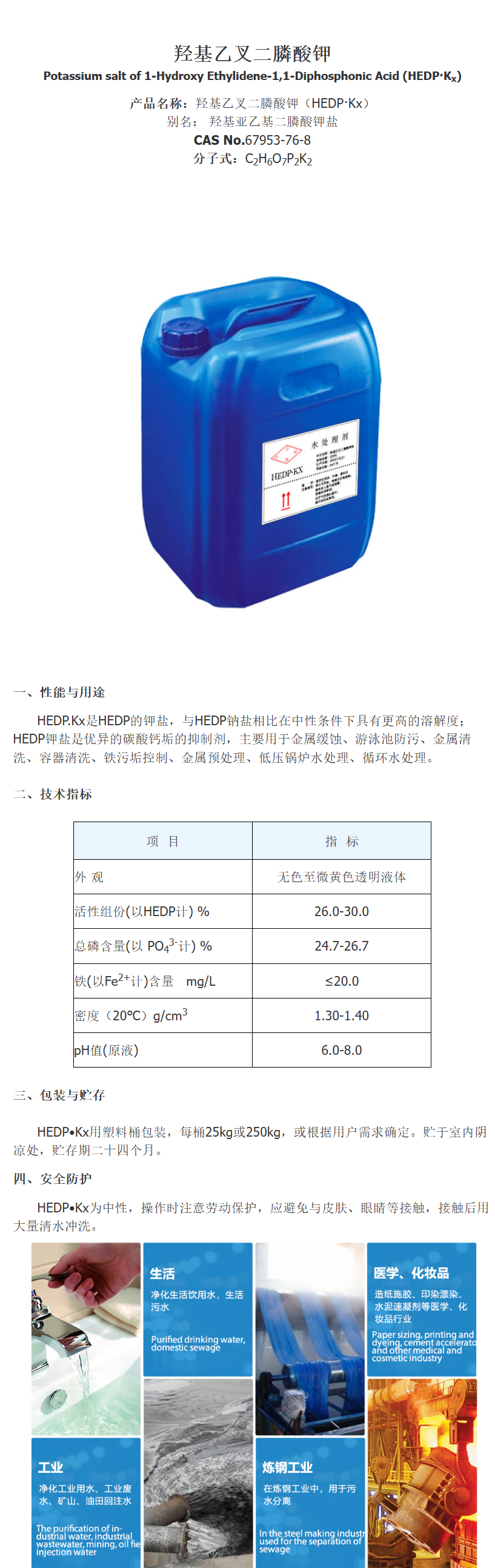 综上所述,羟基乙叉二膦酸钾是一种具有广泛应用价值的化学产品,在金属缓蚀、游泳池防污、金属清洗与预处理以及水处理等领域发挥着重要作用。同时,在使用过程中也需要注意其安全信息,确保操作人员的安全。