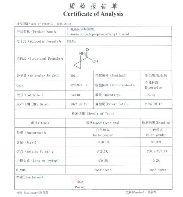 1-氨基环丙烷羧酸 纯度98% 白色粉末 中间体合成 调节乙烯 cas22059-21-8