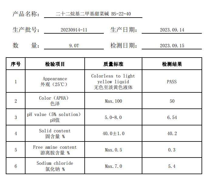 二十二烷基二甲基甜菜碱BS-22 固含量40% 灭火泡沫剂 织物柔软剂 抗静电剂
