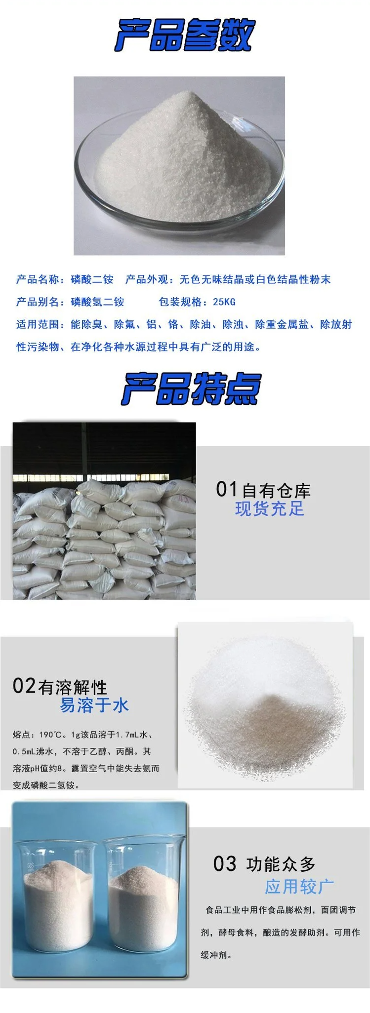 用途:主要用于木材,纸张织物作防火剂,也用作防火涂料添加剂,污水处理剂,除铅剂,还用于印刷制版的制造等。在食品工业用作发酵剂,营养剂等。在农业上磷酸二氢铵作为无氯型N、P二元复合肥使用,其总养分分(N+P2O5)为74%,是配制N、P、K三元复混肥的 基础原料