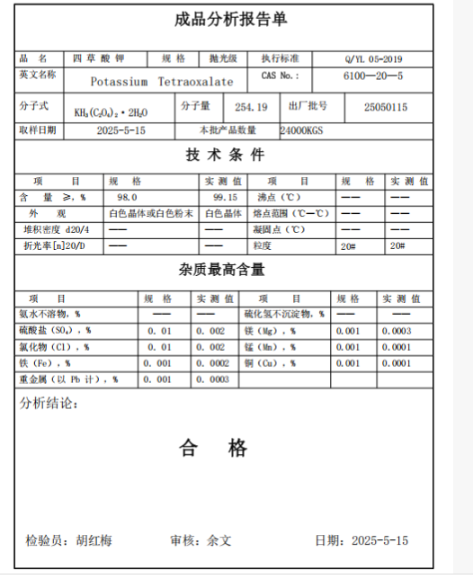 抛光级四草酸钾 纯度98% 白色晶体 大理石抛光剂 除去墨水迹 分析试剂 cas6100-20-5