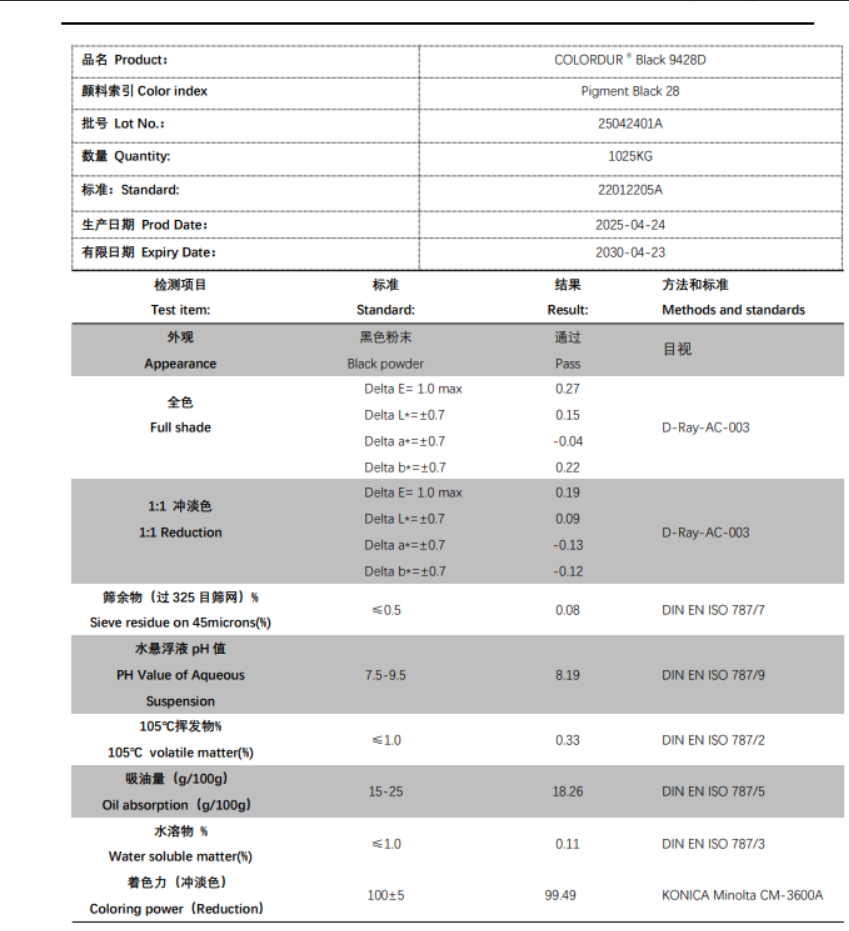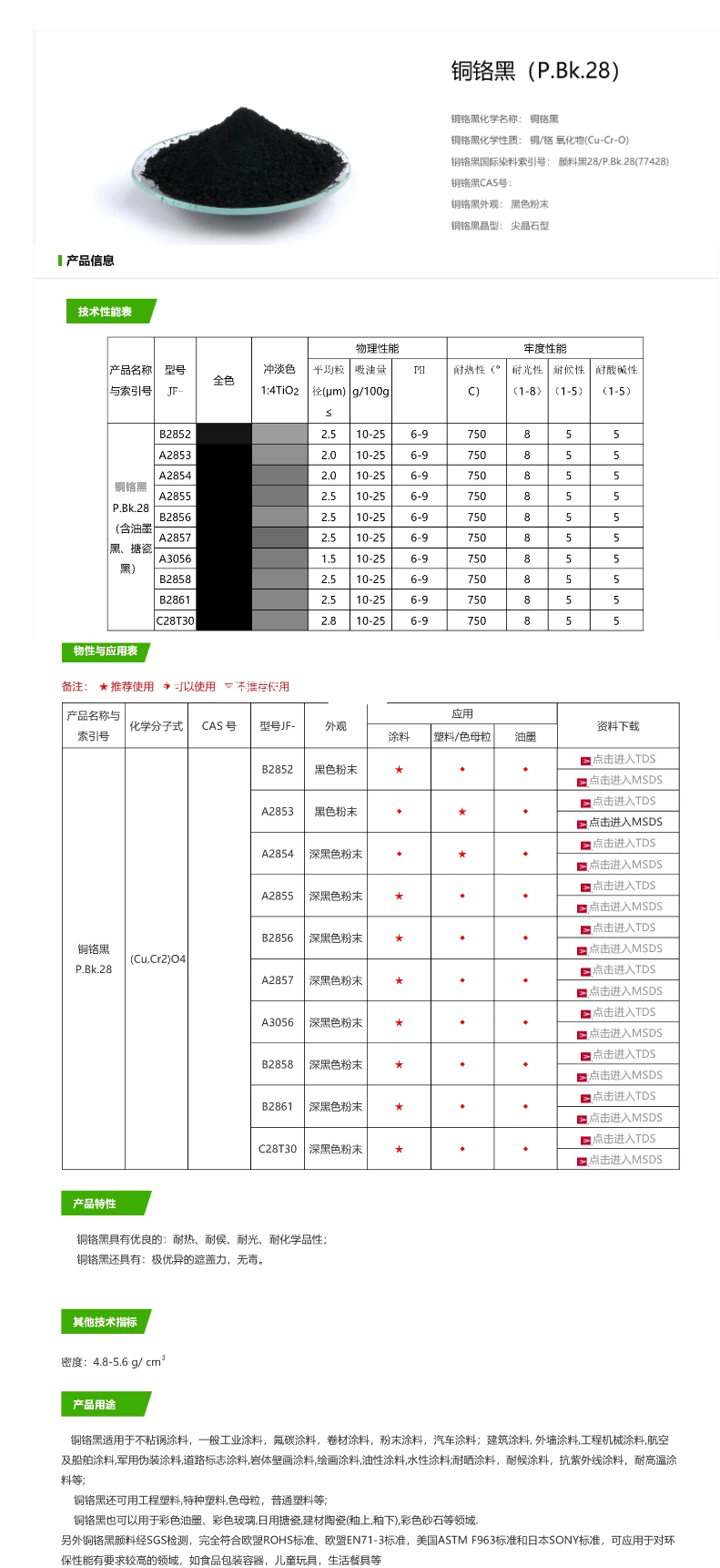 工业级铜铬黑(化学名:亚铬酸铜,化学式 CuCr₂O₄,颜料索引号:P.Bk.28,CAS号:68186-91-4)是一种 尖晶石型金属氧化物混相无机颜料 ,具有 环保无毒、耐高温(可达1000℃)、耐候性好、耐酸碱、遮盖力强、黑度高 等优异特性,广泛应用于多个工业领域。