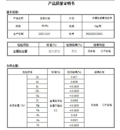 高纯四氯化铪 纯度99.9% 铪57% 高纯铪金属制备 光学镀膜 固态电解质 cas13499-05-3