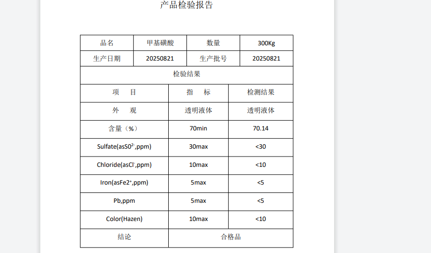 电镀级甲基磺酸 纯度70% 电池电解液 染料磺化剂 印刷电路板 cas75-75-2